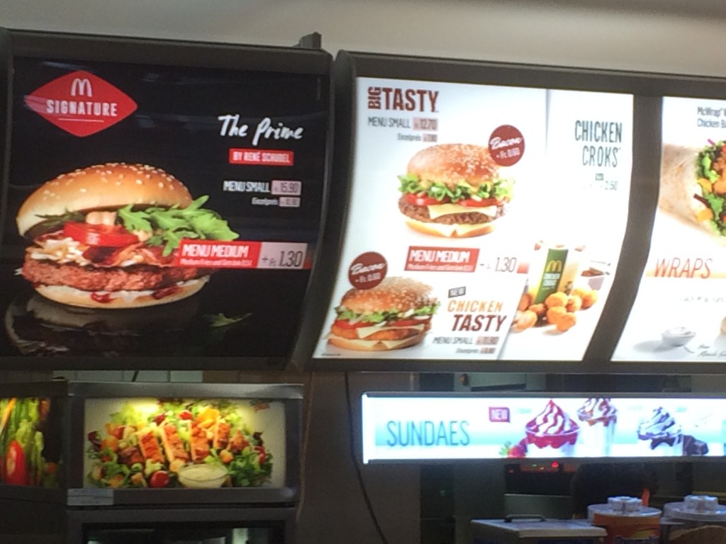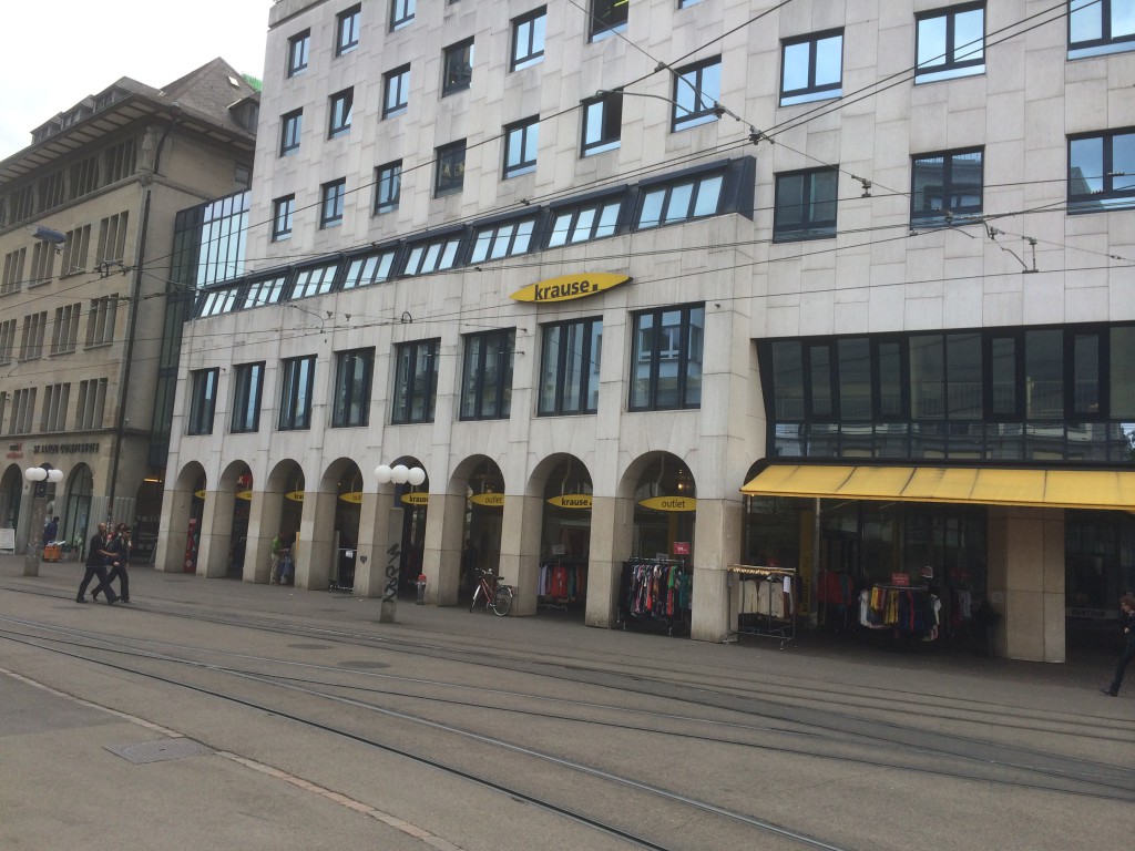 Après avoir rejoint la Bahnoffstrasse – plus grande rue commerçante de Zurich – à pied (une bonne promenade au milieu de l’architecture Zurichoise), je souris toujours de l’enseigne du magasin que je viens de croiser quelques minutes auparavant. Ma promenade a duré pendant plus de trois quarts d’heure et je commence à sentir l’envie de me poser et de manger. On m’avait prévenu de la différence de niveau de vie entre nos deux pays, mais la je prends une vraie claque : le moindre plat unique ( ici, une escalope de poulet frite) côute entre 16 et 19 francs ( 14 et 16,70 €). Je me rabats donc sur une enseigne bien connu, mais la douloureuse fut présente de la même manière ( 20 francs tout seul soit 17,60 € pour un menu et un sandwich).